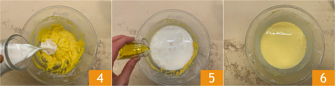Adicione o leite 4 e o óleo 5 e misture novamente até obter uma massa lisa e sem grumos 6.