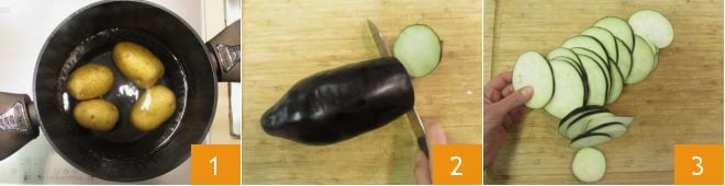Para preparar as berinjelas assadas com batatas, primeiro cozinhe as batatas por cerca de 20 minutos 1: elas devem permanecer bem firmes. Enquanto isso, retire as pontas da berinjela 2 e corte-a em rodelas de cerca de 5 mm de espessura 3.