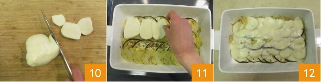 Enquanto isso, corte a scamorza em fatias 10. Após os 20 minutos de cozimento, retire do forno e adicione as fatias de scamorza por cima 11, depois leve ao forno novamente por cerca de 5 minutos, até que o queijo derreta. Suas berinjelas assadas com batatas estão prontas para serem servidas 12!