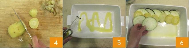 Após o tempo de cozimento das batatas, descasque-as e corte-as também em rodelas de cerca de 5 mm de espessura 4. Neste ponto, unte uma assadeira 5 e coloque uma primeira camada de berinjelas, sobrepondo levemente as fatias. Continue com uma camada de batatas, sobrepondo parcialmente com as berinjelas, e continue alternando os dois ingredientes até que acabem 6.