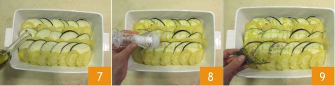 Tempere com um fio de óleo 7, sal 8, pimenta e algumas folhinhas de tomilho 9, depois asse em forno ventilado pré-aquecido a 180° por 20 minutos.
