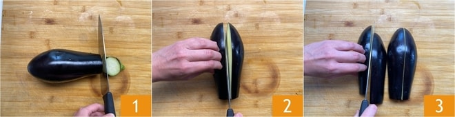 Para preparar as berinjelas na frigideira, primeiro lave bem as berinjelas e retire as pontas 1. Corte-as ao meio no sentido do comprimento 2 e divida cada metade novamente ao meio 3.