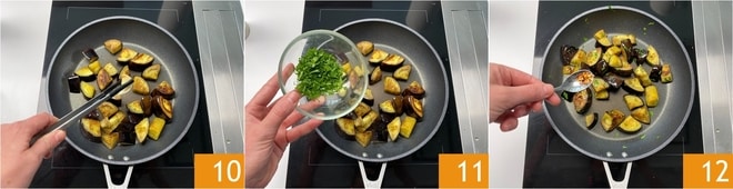Após cerca de 15 minutos, as berinjelas estarão cozidas, macias e bem douradas. Retire o dente de alho 10, tempere com salsa picada 11 e pimenta seca 12.