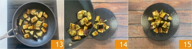 Mexa as berinjelas 13, transfira-as para um prato de servir 14 e sirva-as 15.