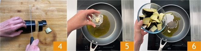 Agora, corte-as em cubos grandes, de cerca de 2 cm 4. Em uma frigideira, coloque um fio de azeite e um dente de alho 5. Aqueça e depois adicione as berinjelas 6.