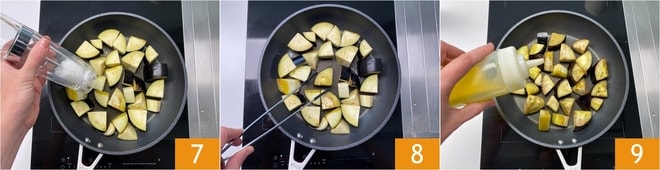 Salpique sal 7 e deixe cozinhar em fogo médio-alto por alguns minutos. Com uma pinça, vire os cubos de berinjela 8; você perceberá que o azeite foi completamente absorvido pelas berinjelas, então adicione um pouco mais 9. Neste ponto, as berinjelas estarão mais macias e você poderá mexê-las, ou virá-las, sem usar a pinça.