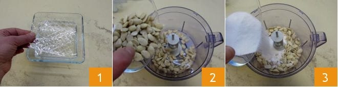 Para preparar o biancomangiare, amoleça a gelatina em folhas em um recipiente com água fria por pelo menos 10 minutos 1. Coloque as amêndoas descascadas 2 junto com o açúcar em um processador equipado com lâminas 3