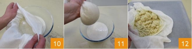 depois esprema bem o pano para liberar todo o líquido e coletá-lo na tigela (10-11). Coloque as amêndoas trituradas e amolecidas contidas no pano em uma assadeira forrada com papel manteiga 12,