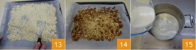 distribuindo-as de maneira uniforme com a ajuda de uma espátula 13: você pode usá-las para a decoração final. Asse em forno estático pré-aquecido a 180° por 30 minutos (ou a 160° por 20 minutos se em forno ventilado), até que fiquem bem douradas e crocantes 14; retire do forno, deixe esfriar completamente e reserve. Despeje o líquido que você obteve anteriormente em uma panela, aquecendo em fogo baixo por 3-4 minutos (não deve ferver) 15.