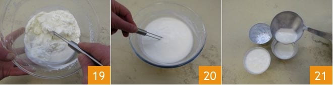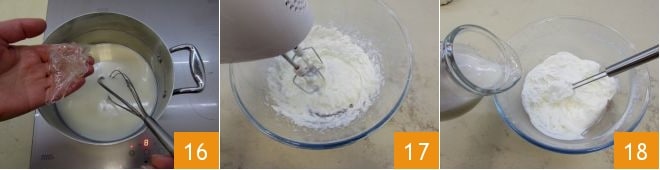 Esprema bem a gelatina em folhas e adicione-a à mistura 16, mexendo bem até dissolver completamente, depois desligue e deixe esfriar. Bata o creme de leite com uma batedeira 17 e, quando a mistura estiver completamente fria, adicione-a ao creme de leite batido aos poucos 18;