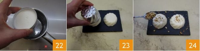 Em seguida, desenforme a sobremesa, mergulhando as formas em água quente por alguns segundos 22. Sirva em um prato de servir 23 e, finalmente, decore o biancomangiare distribuindo a gosto as amêndoas crocantes que você preparou 24.