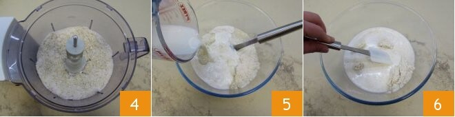 e triture-as 4. Transfira as amêndoas trituradas para uma tigela, adicione o leite 5 e misture bem com uma espátula 6