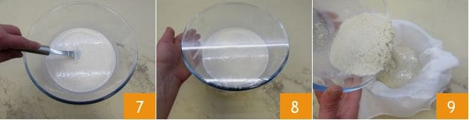 até obter uma mistura homogênea e sem grumos 7; cubra com filme plástico e deixe em infusão por uma noite inteira 8. Após o tempo necessário, coe a mistura através de um pano colocado dentro de uma tigela 9,