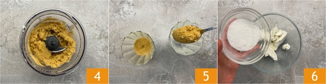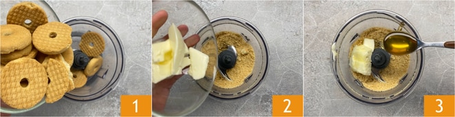 Para preparar os copinhos de ricota e framboesas, primeiramente coloque os biscoitos em um mixer 1 e triture até obter um pó. Adicione a manteiga em ponto de pomada 2 e o mel 3.