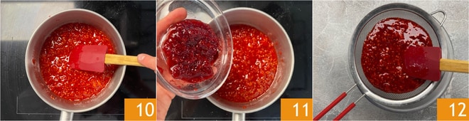 Cozinhe em fogo baixo, mexendo continuamente 10 até que as framboesas se desmanchem, isso levará cerca de 5 minutos. Adicione a geleia de framboesas 11 e mexa uma última vez para misturar os ingredientes. Passe a mistura por uma peneira de malha fina para eliminar as sementes das framboesas 12 e deixe esfriar completamente.