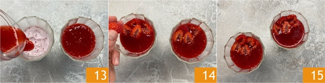 Uma vez resfriado, despeje o coulis de framboesas nos copinhos 13 e decore com framboesas frescas 14. Seus copinhos de ricota e framboesas estão prontos para ser servidos 15!