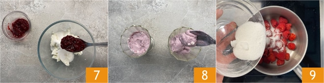 Adicione a geleia de framboesas 7 e mexa até obter um creme homogêneo. Pegue os copinhos e preencha-os com o creme 8, depois nivele e coloque novamente na geladeira por pelo menos 20 minutos. Enquanto isso, dedique-se à preparação do coulis de framboesas: em uma panela, coloque as framboesas e o açúcar 9.