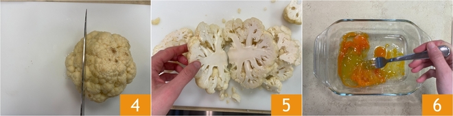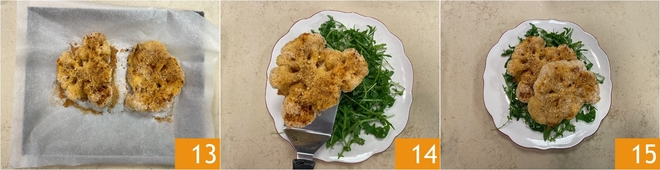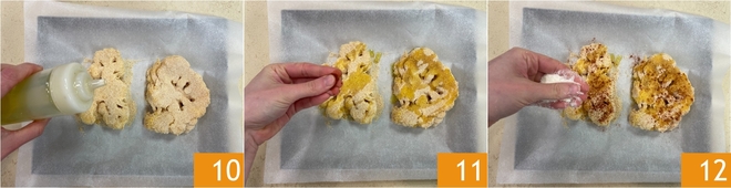 Passe as fatias de couve-flor primeiro no ovo 7, depois na farinha de rosca 8, de forma a cobri-las uniformemente. Coloque-as em uma assadeira forrada com papel manteiga 9.