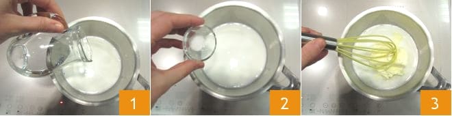 Para preparar os profiteroles com creme de confeiteiro de parmesão e limão, comece preparando a massa choux. Coloque em uma panela o leite, a água 1 o sal, o açúcar 2 e a manteiga 3. Deixe derreter em fogo baixo e leve à fervura,