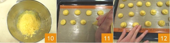 Continue misturando por alguns minutos, até obter uma massa lisa e uniforme 10. Transfira para um saco de confeitar e forme os seus profiteroles em uma assadeira forrada com um tapete de silicone (ou papel manteiga), cuidando para espaçá-los bem uns dos outros 11. Você deve obter cerca de 20 profiteroles. Abaixe as pontas dos profiteroles exercendo uma leve pressão com a ponta dos dedos umedecidos 12, depois proceda com o cozimento em forno estático pré-aquecido a 200° por 25 minutos.