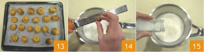 Preste atenção para não abrir a porta do forno durante o cozimento e, uma vez prontos, deixe esfriar os seus profiteroles dentro do forno com a porta entreaberta 13. Enquanto isso, prepare o creme: coloque o leite em uma panela e aromatize-o com noz-moscada 14, o sal 15