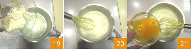 Misture a composição e adicione ao leite já fervendo 19. Continue mexendo com um batedor até engrossar o creme por alguns minutos 20. Em seguida, adicione as gemas 21,