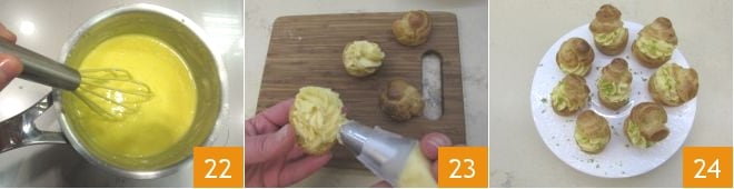 misture imediatamente e continue mexendo por um minuto, até que o creme fique perfeitamente espesso 22. Deixe esfriar, coberto com filme plástico em contato, depois coloque em um saco de confeitar com bico estrela. Corte os profiteroles ao meio e recheie-os com o creme 23, e, por fim, complete com uma raspadinha de casca de limão. Seus profiteroles com creme de confeiteiro de parmesão e limão estão prontos para serem degustados 24!