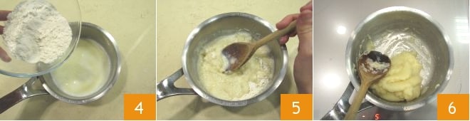 em seguida, retire do fogo por um momento e adicione a farinha 4, misturando imediatamente para evitar a formação de grumos 5. Coloque a panela novamente no fogo e cozinhe a mistura até que fique bem lisa e, no fundo da panela, você verá aparecer uma película 6.