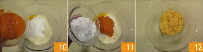 Adicione também a polpa de abóbora 10, o amido de batata 11, o açúcar e amasse 12.