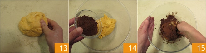 Você deve obter uma massa homogênea 13. Divida a massa em duas partes iguais. Uma mantenha assim e na outra adicione o cacau 14. Trabalhe para misturar 15.
