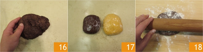 Assim, você obterá uma massa escura 16. Cubra com filme plástico ambas as massas 17 e deixe descansar na geladeira por 30 minutos. Após o tempo, abra a massa escura a uma espessura de cerca de 4-5 mm 18.