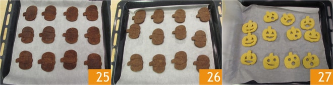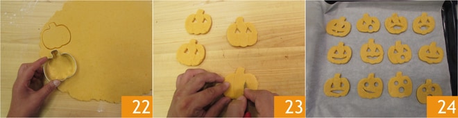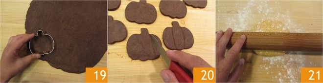 Faça 20 biscoitos com moldes em forma de abóbora de cerca de 7 cm 19. Com uma faquinha, faça cortes 20. Abra agora da mesma forma a massa clara 21.