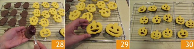 Recheie os biscoitos escuros com a geleia 28 e feche-os com o biscoito claro 29. Os biscoitos bicolores de cacau e abóbora estão prontos para serem saboreados 30.