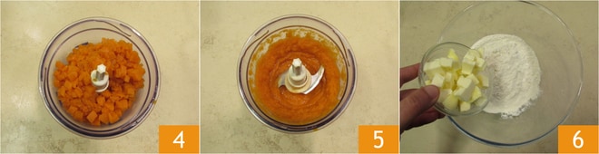 Uma vez cozida, bata-a 4 para obter um purê 5, você obterá cerca de 200 g de purê. Deixe esfriar. Quando a abóbora estiver fria, prepare a massa. Despeje a farinha e a manteiga em uma tigela 6.
