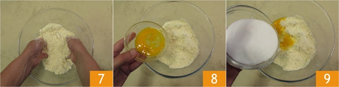 Trabalhe com as mãos para criar uma textura arenosa 7, depois adicione a gema 8 e o açúcar 9.