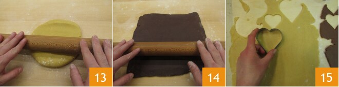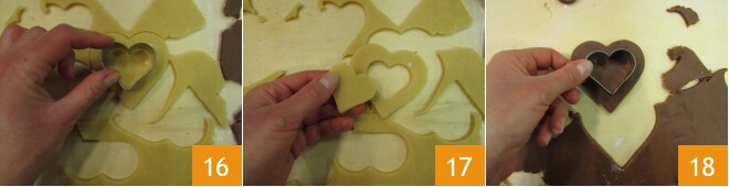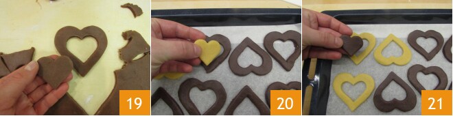 Usando um cortador de biscoitos em forma de coração menor com 4,5 cm de largura e 4 cm de comprimento, recorte o biscoito 16, de modo a obter um coração maior "vazio" e um menor "cheio". Separe as duas partes 17, mantendo ambas, pois serão usadas em breve. Passe para a massa de cacau e faça a mesma operação: recorte um biscoito em forma de coração e depois recorte com o molde menor 18.