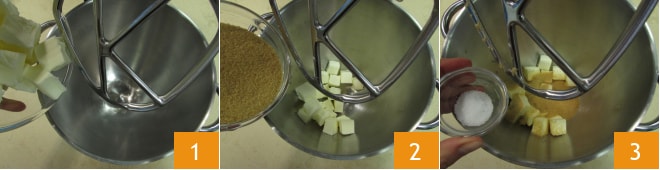 Para preparar os biscoitos de coração bicolor, a primeira coisa a fazer é colocar a manteiga fria na tigela de uma batedeira planetária equipada com pá 1. Adicione o açúcar mascavo 2 e o sal 3. Trabalhe em velocidade moderada até obter uma mistura homogênea e cremosa.