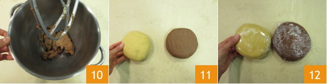 e trabalhe com a pá até ser absorvido 10. Neste ponto, você terá duas massas, uma branca e uma negra 11. Envolva-as em filme plástico separadamente 12 e deixe-as descansar na geladeira por uma hora.