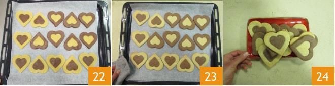 Continue desta forma até terminar ambas as massas 22. Asse os biscoitos em forno estático pré-aquecido a 180° por 15 minutos na prateleira inferior. Depois retire do forno e deixe esfriar os biscoitos antes de retirá-los da assadeira e servi-los 24.