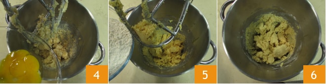Adicione as gemas 4 e trabalhe até que estejam bem incorporadas. Em seguida, adicione também a farinha 5 e continue a trabalhar até que esteja completamente incorporada 6.