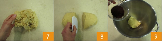 Transfira para uma superfície 7 e trabalhe por alguns segundos para compactá-la. Divida a massa ao meio 8 e transfira uma das partes de volta para a batedeira. Adicione o cacau 9
