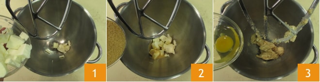 Para preparar os biscoitos bicolores, na tigela da batedeira, coloque a manteiga fria em cubos 1 e o açúcar mascavo 2. Trabalhe os ingredientes com a pá por alguns minutos, depois adicione o ovo em temperatura ambiente 3. Trabalhe até obter uma mistura homogênea.