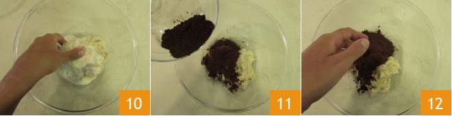 Trabalhe rapidamente com as mãos, até que esteja bem incorporada. Na segunda tigela, adicione o cacau previamente peneirado. Trabalhe rapidamente com as mãos para misturar os ingredientes, mas sem aquecer demais a massa 12.