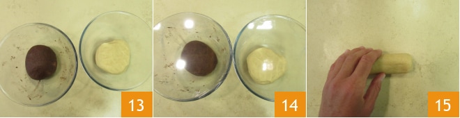 Quando tiver obtido duas massas homogêneas 13, cubra com plástico filme 14 e deixe descansar na geladeira por pelo menos 30 minutos. Retire as massas da geladeira. Comece pela massa branca. Pegue-a e trabalhe-a na bancada para formar um rolo 15, com espessura de 1 cm.