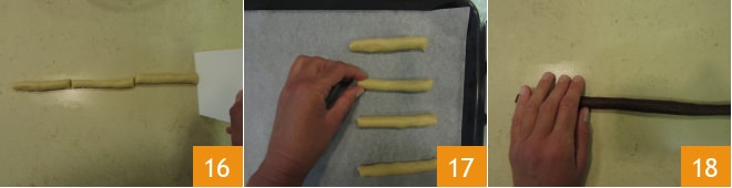 Então, corte tiras de 10 cm 16, cortando a massa com uma faca ou espátula. Coloque delicadamente em uma assadeira forrada com papel manteiga ou em uma bandeja 17. Continue até terminar a massa branca, depois cuide da massa de cacau. Assim como antes, faça um rolo com espessura de 1 cm 18.