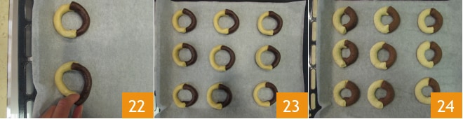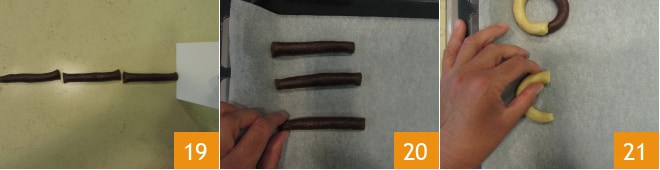 Agora, pegue uma tira de cacau e, dando-lhe a mesma forma, coloque-a de um lado sobre a massa branca e do outro por baixo. Em seguida, pressione delicadamente com as mãos para uni-los 22. Você obterá biscoitos com um diâmetro de cerca de 8 cm. Continue assim até terminar as tiras e formar todos os biscoitos 23. Agora, passe para a cozedura: asse os biscoitos em forno convencional pré-aquecido a 170°C por 25 min, na prateleira do meio, forno convencional. Então, tire do forno e deixe esfriar 24 antes de transferir os biscoitos para uma bandeja ou uma lata.