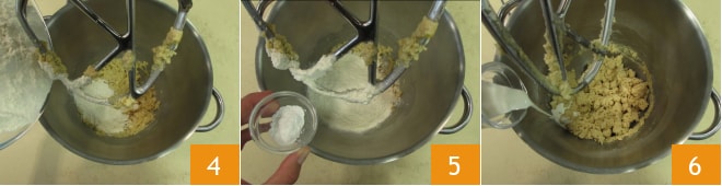 Adicione à mistura a farinha de trigo 4 e o fermento previamente peneirado 5. Trabalhe por alguns segundos e adicione também o creme de leite fresco 6.