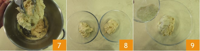 Continue trabalhando, ainda com a pá, até obter uma massa homogênea e compacta 7. Depois divida a massa em duas partes iguais e transfira para duas tigelas diferentes. Em uma delas, adicione a farinha de amêndoas 9.