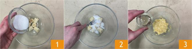 Para preparar os biscoitos com bananas maduras, coloque a banana em pedaços numa tigela, adicione o açúcar 2 e amasse a mistura com um garfo 2 até obter um purê. Neste ponto, acrescente o óleo vegetal 3.