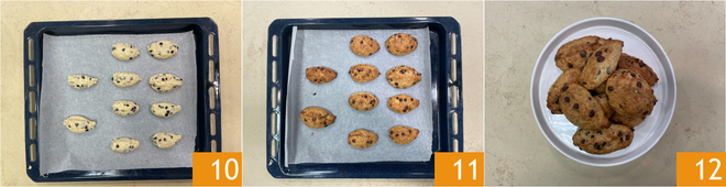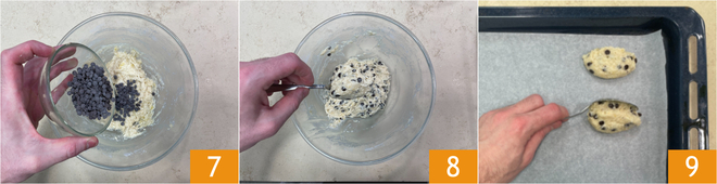 Por fim, acrescente as gotas de chocolate 7 e misture 8. Modele quenelles ajudando-se com duas colheres e disponha-as em uma assadeira forrada com papel manteiga 9.
